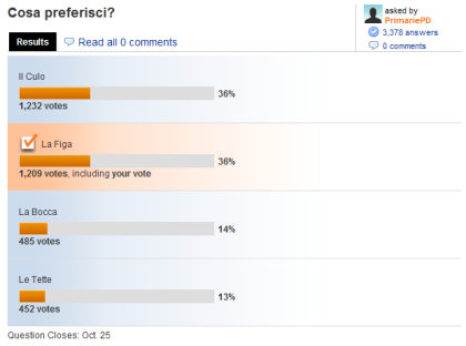 Il plauso della maggioranza degli italiani è andato soprattutto alla figa e al culo. Fino a qualche giorno fa si aveva la sensazione che quest’ultimo potesse vincere le primarie agevolmente, con un certo scarto.